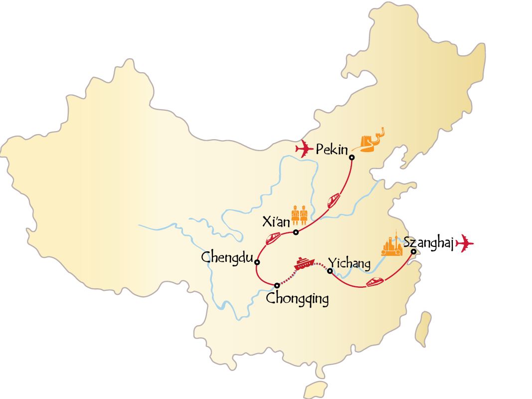- Przejazdy wg programu pociągami (miejsca siedzące w 2 klasie na trasach Pekin – Xi’an – Chengdu - Chongqing, Yichang - Szanghaj), autokarami lub mikrobusami.
