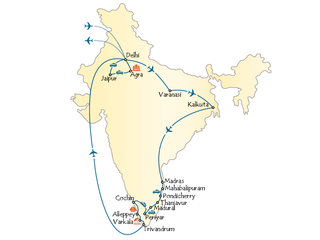 Dookoła Indii 20 dni to w naszej ofercie wycieczek trasa obejmująca największy obszar Indii i najpełniej prezentująca subkontynent. Podczas 20 dni zobaczą Państwo północny Złoty Trójkąt, święte miasto Varanasi i kilkunastomilionowe metropolie Kalkuty na wschodzie i Bombaju na zachodzie półwyspu oraz najciekawsze atrakcje południowych stanów Tamil Nadu, Kerala i Karnataka. Dwa dni zostały zarezerwowane na wypoczynek na plaży.