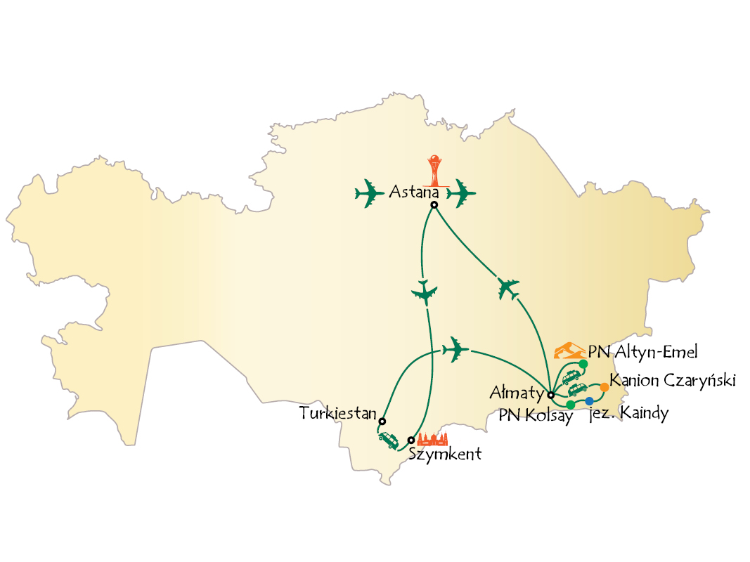 Przylot do Astany – stolicy Kazachstanu. Zwiedzanie rozpoczniemy od razu po przylocie wizytą na placu Niepodległości. To główny plan miasta, gdzie mają miejsce wszystkie ważne święta, festiwale, parady. Nad placem góruje 91-metrowa kolumna zwana Kazakh Eli Monument, na szczycie której znajduje się figura mitycznego ptaka Samruk. Przy placu zobaczymy też ważne budynki użyteczności publicznej – Muzeum Narodowe, które zwiedzimy, meczet Hazret Sultan, miejscową Akademię Sztuk Pięknych oraz Mur Pokoju o długości 111 m, na którym słowo „pokój” wypisano w 51 językach. W bliskiej odległości znajduje się też Bayterek, do którego wejdziemy – główny punkt orientacyjny nowoczesnej dzielnicy Astany, zwany przez lokalnych mieszkańców „drzewem życia”. Zobaczymy również Pałac Pokoju i Pojednania, jeden z najbardziej charakterystycznych budynków w mieście. Tę piramidalną budowlę zaprojektował brytyjski architekt Norman Foster. Nocleg w Astanie.